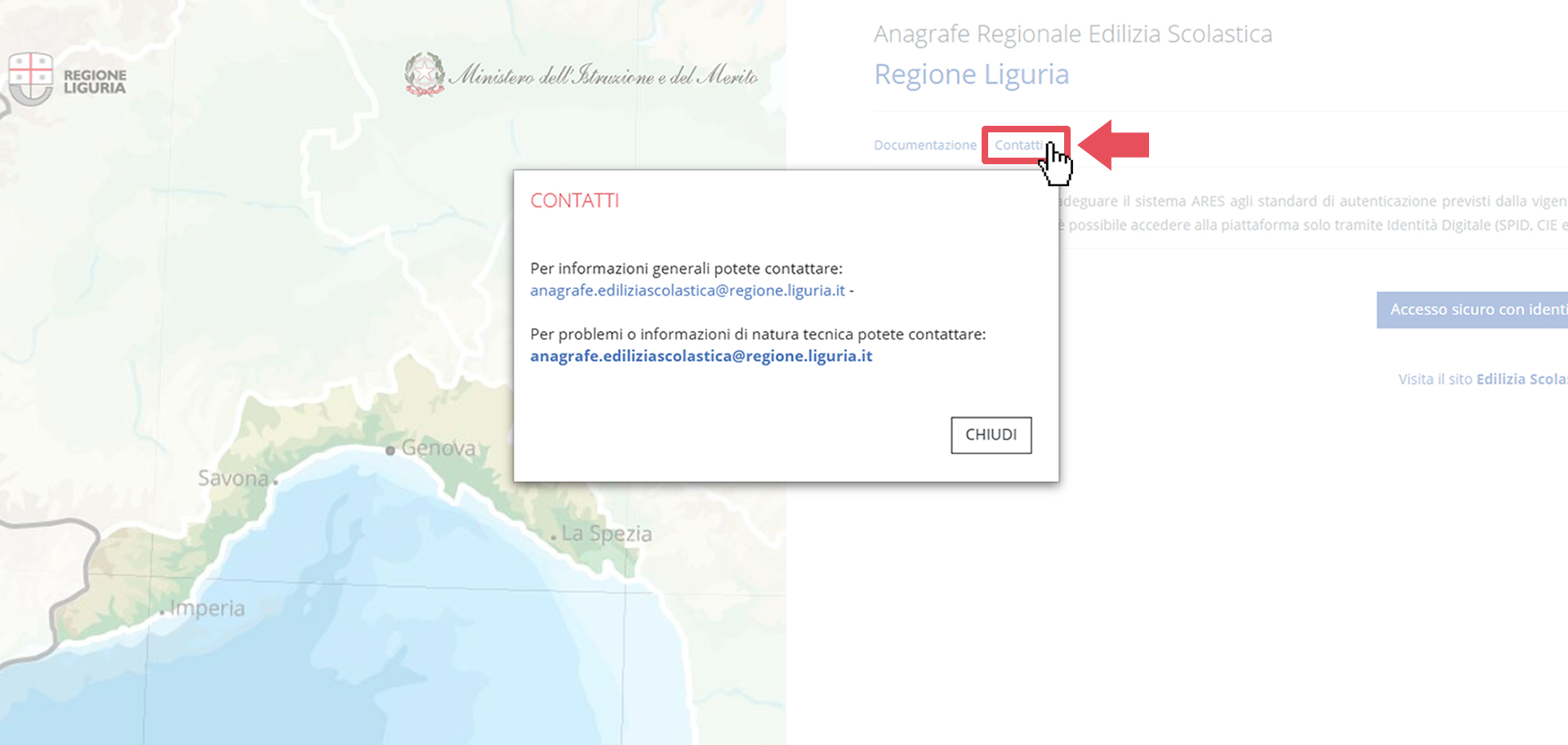Sempre dalla pagina di login, accedendo alla voce "Contatti", l’utente potrà visualizzare i contatti dei responsabili del sistema ARES e tutte le informazioni per l’assistenza tecnica al sistema informativo.