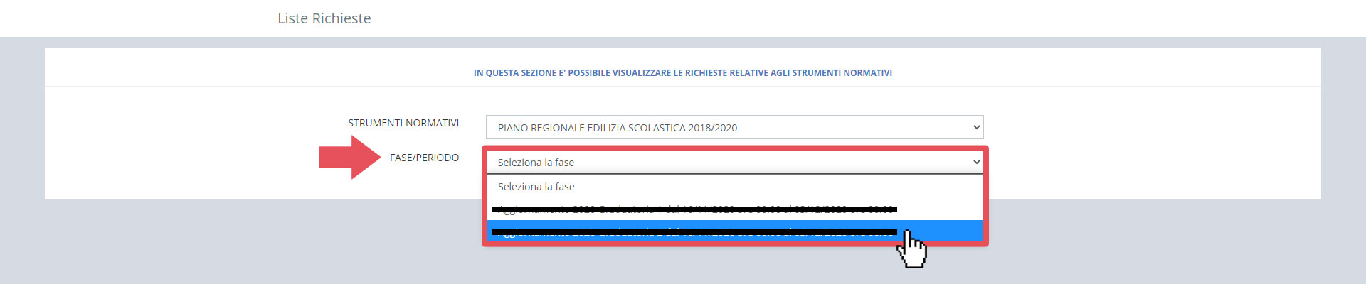 Qui possiamo selezionare lo "Strumento Normativo" e la "Fase" di cui si desidera visualizzare le richieste.