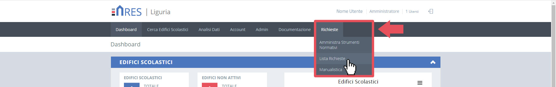 Per accedere alla pagina "Lista Richieste" cliccare sulla voce "Richieste" del menu e successivamente sulla voce "Lista Richieste ".