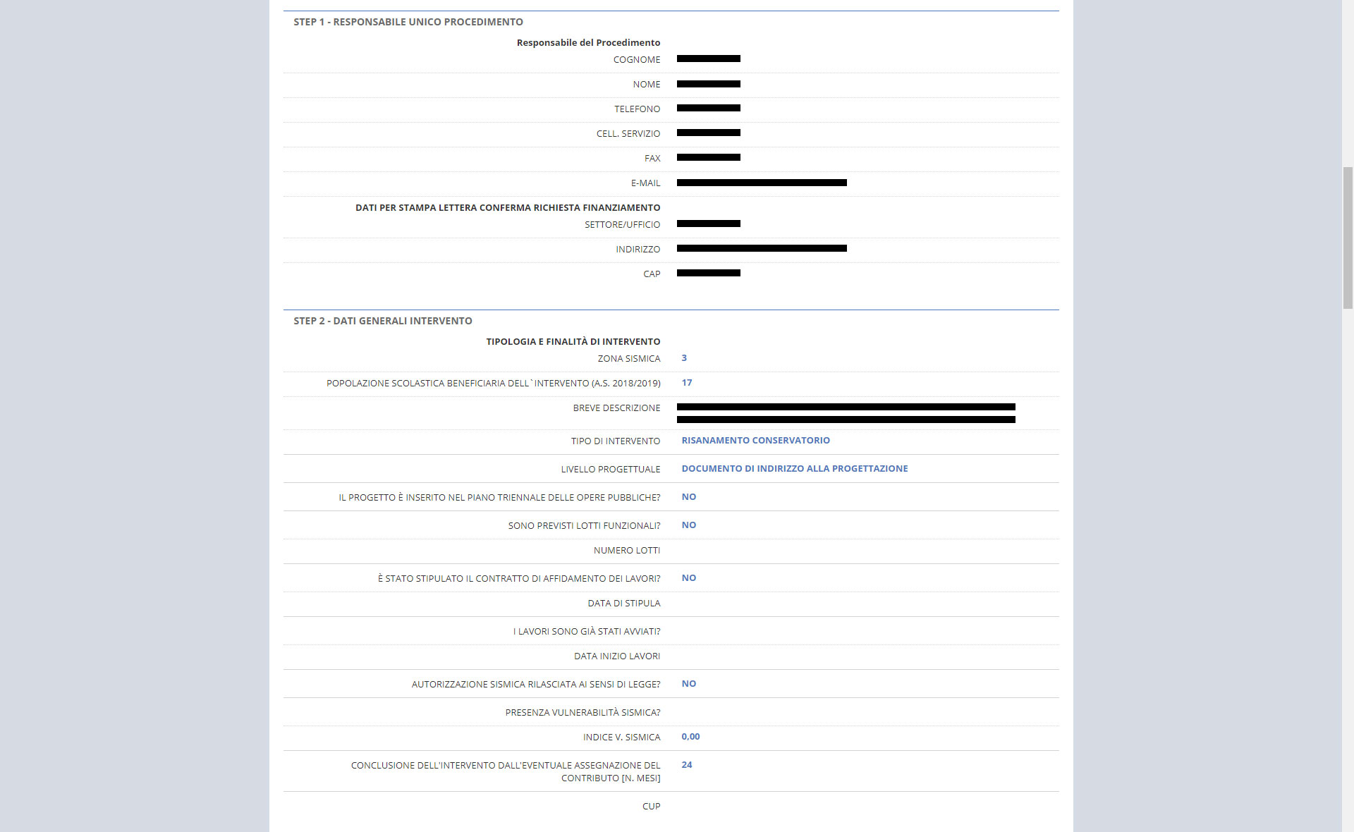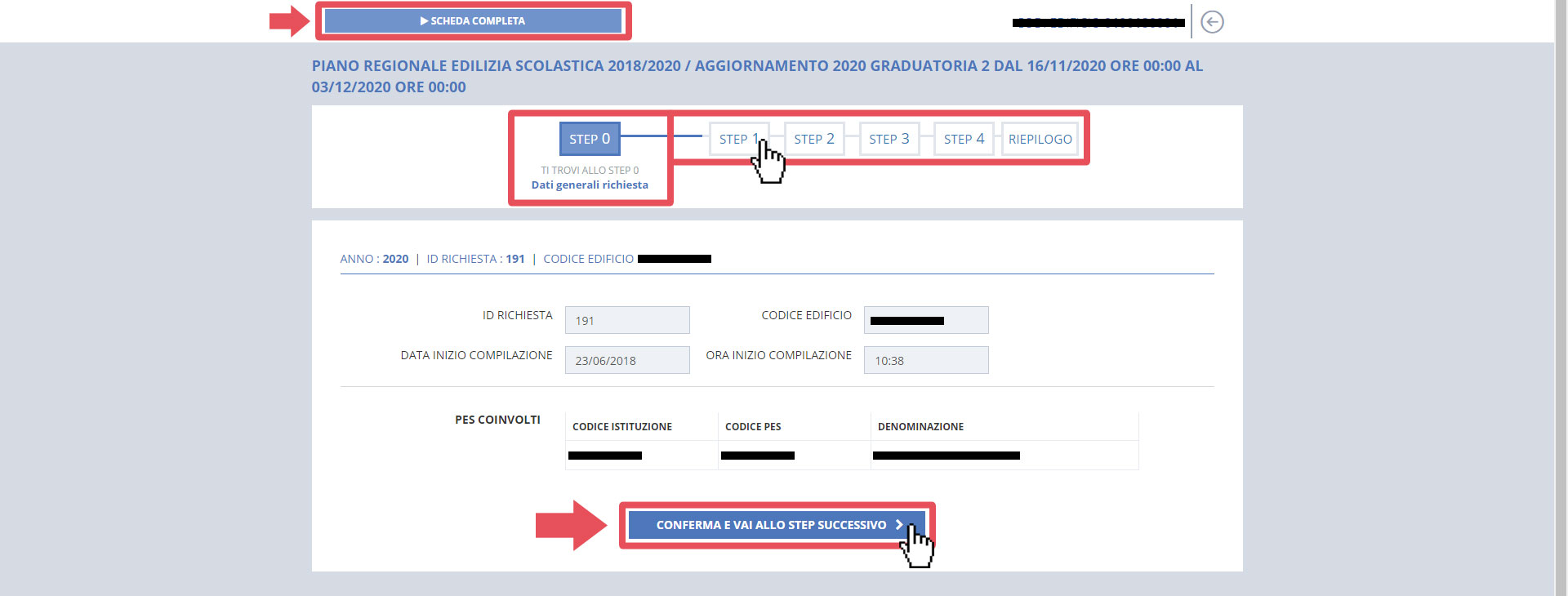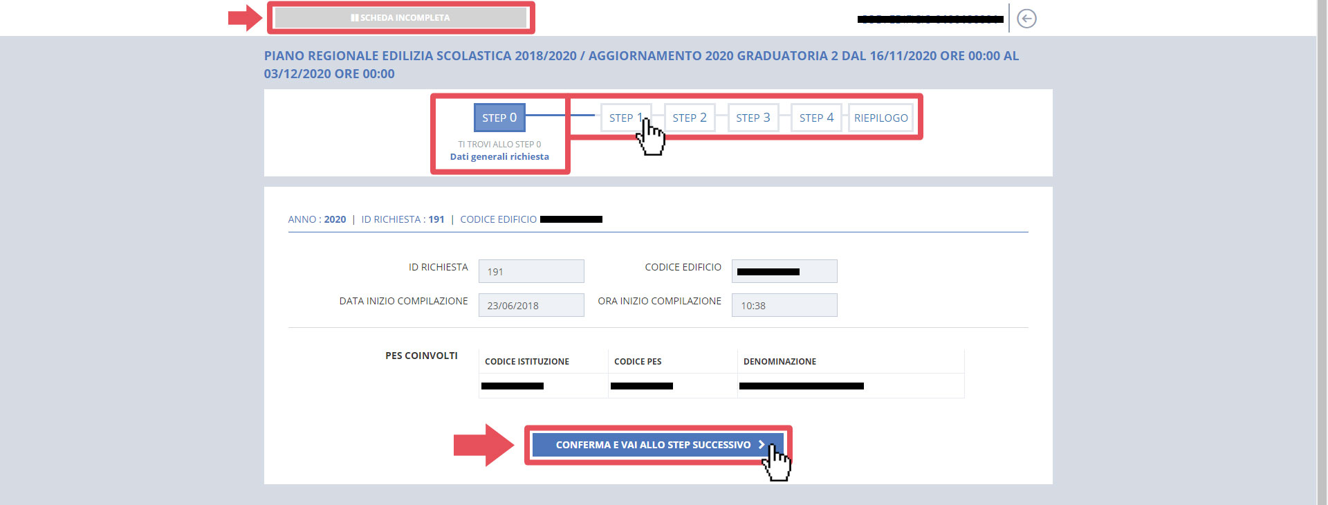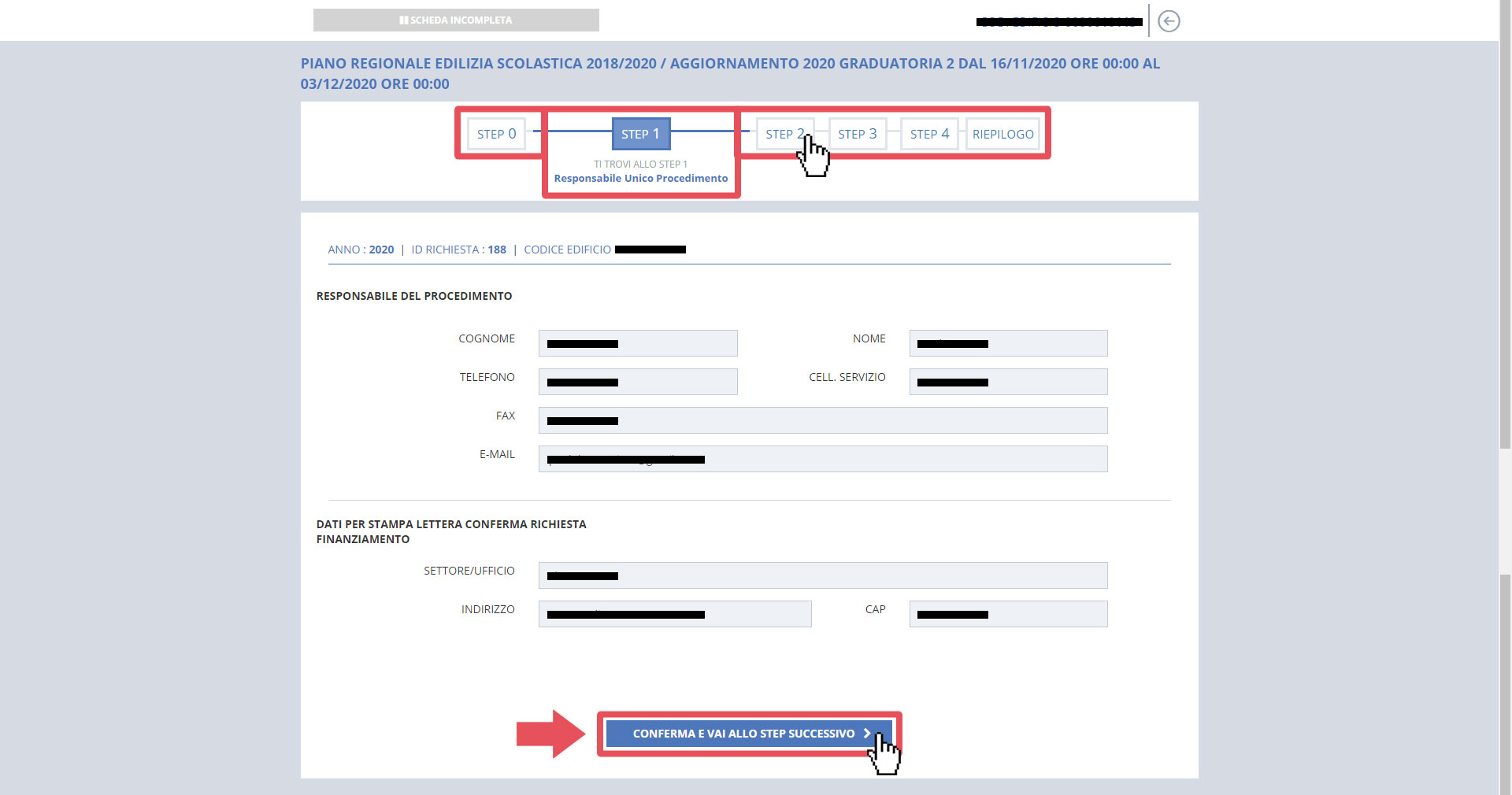 All'interno della scheda si può passare da uno step all’altro in qualunque momento tramite il menu di navigazione degli step posto sopra la scheda. Si consiglia di prestare particolarmente attenzione e di premere il pulsante “CONFERMA E VAI ALLO STEP SUCCESSIVO” prima di abbandonare la pagina, altrimenti i dati inseriti verranno persi.