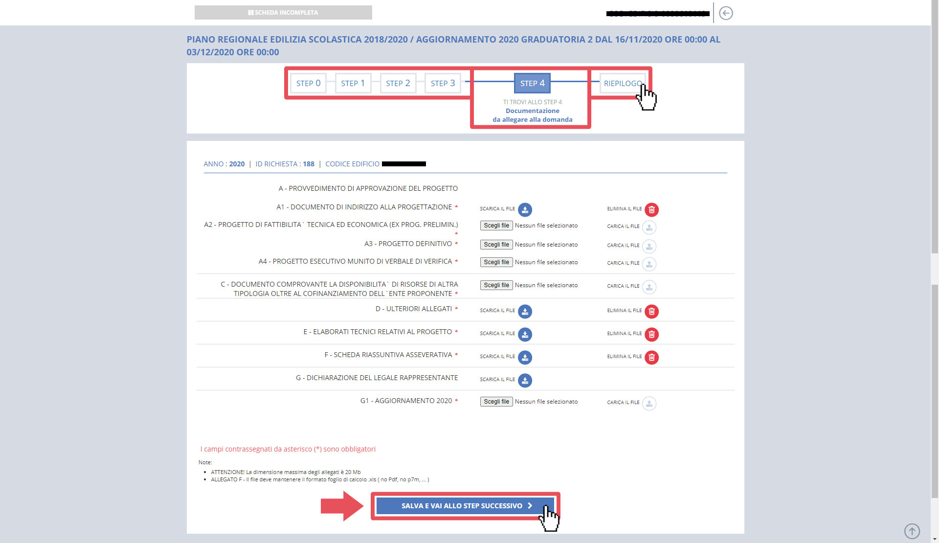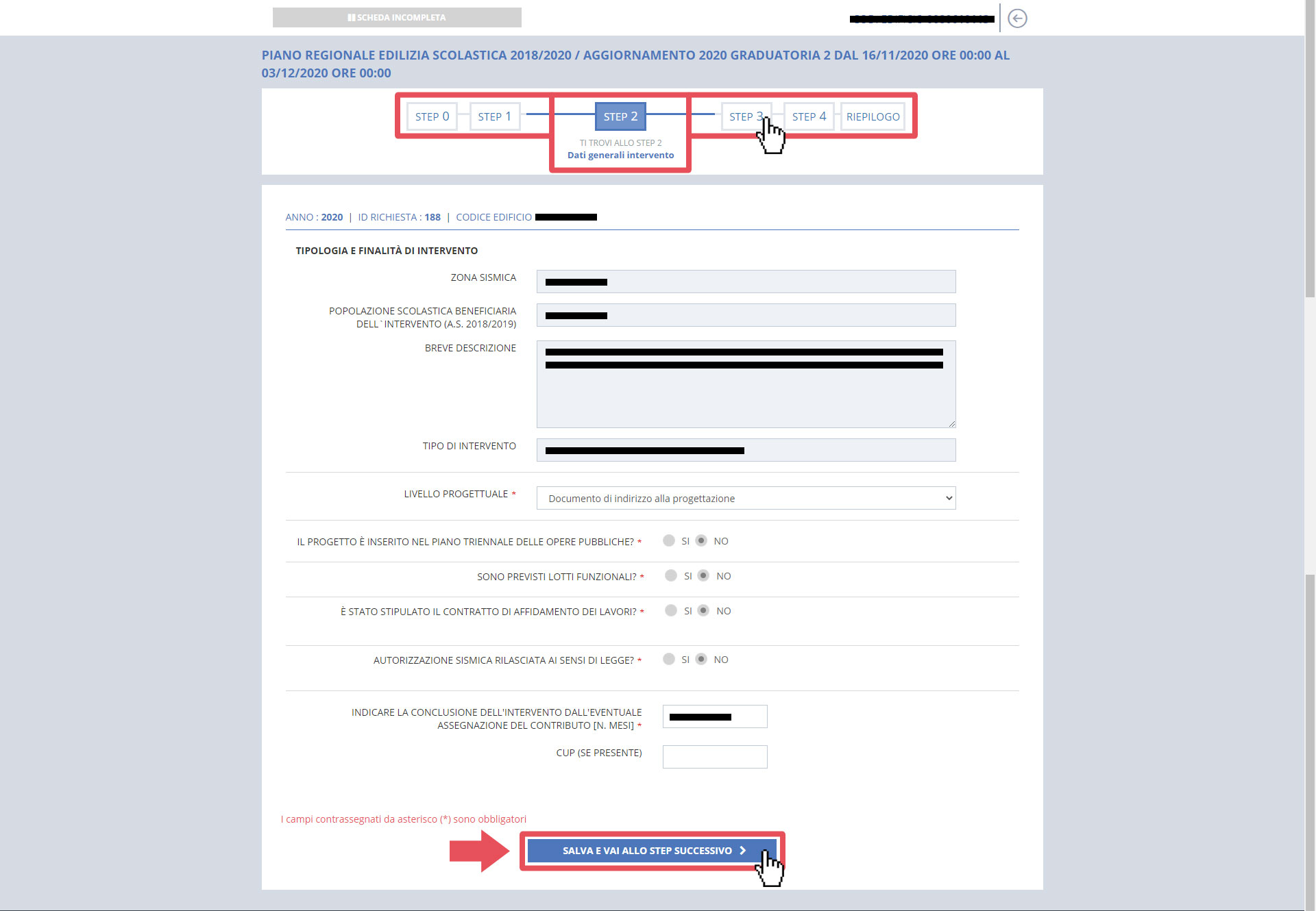 Si ricorda che tutti i dati con asterisco * di colore rosso sono da intendersi obbligatori ai fini del salvataggio dello step.