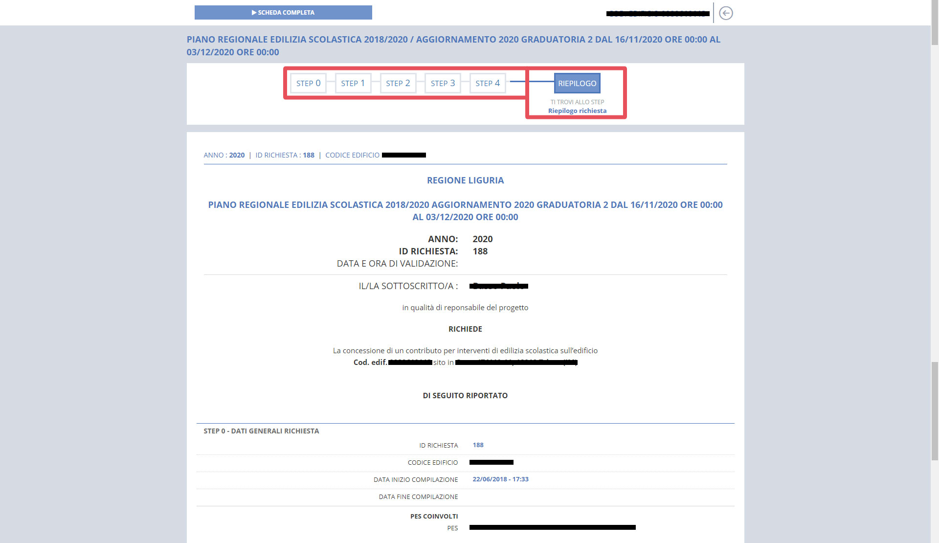Terminate la compilazione dei vari STEP dal numero 1 al numero 4, si passa allo STEP DI RIEPILOGO dove si possono visualizzare tutti i dati inseriti e validare la richiesta.