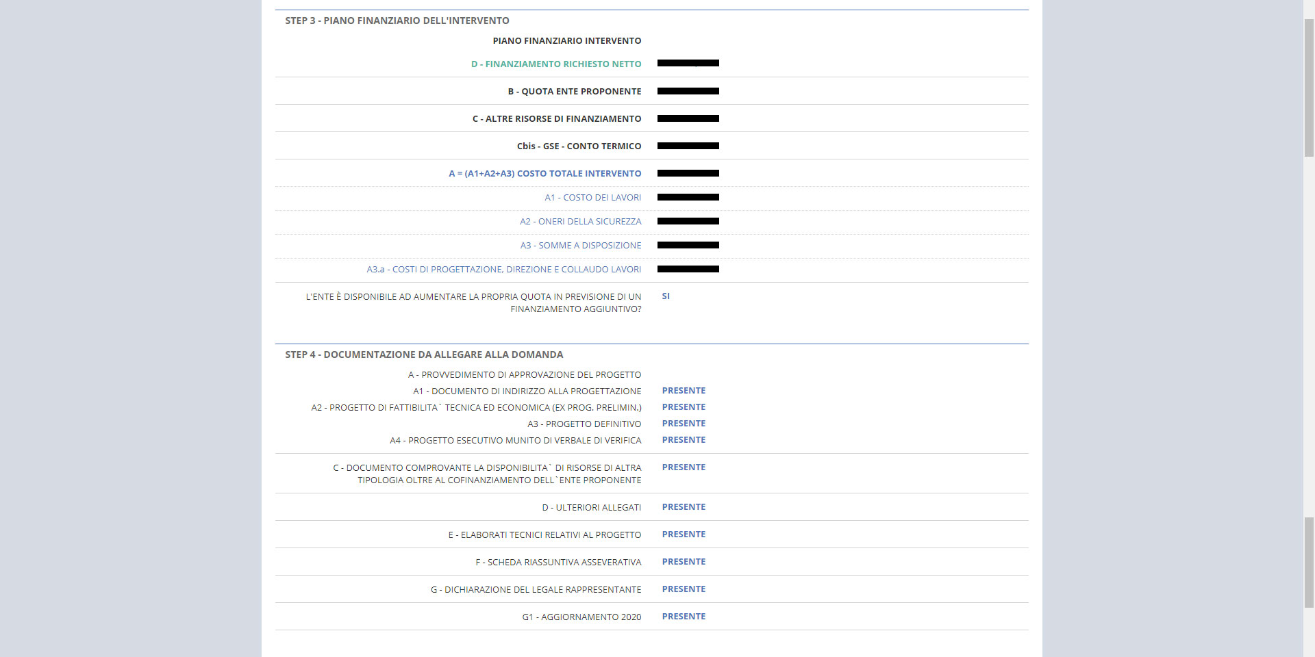La richiesta continua con lo STEP 3- PIANO FINANZIARIO DELL'INTERVENTO in questo step devono essere inserite le varie voci economiche (quote; risorse; costi; oneri; ecc). Il sistema calcola in automatico il FINANZIAMENTO RICHIESTO NETTO, sulla base dei dati inseriti.