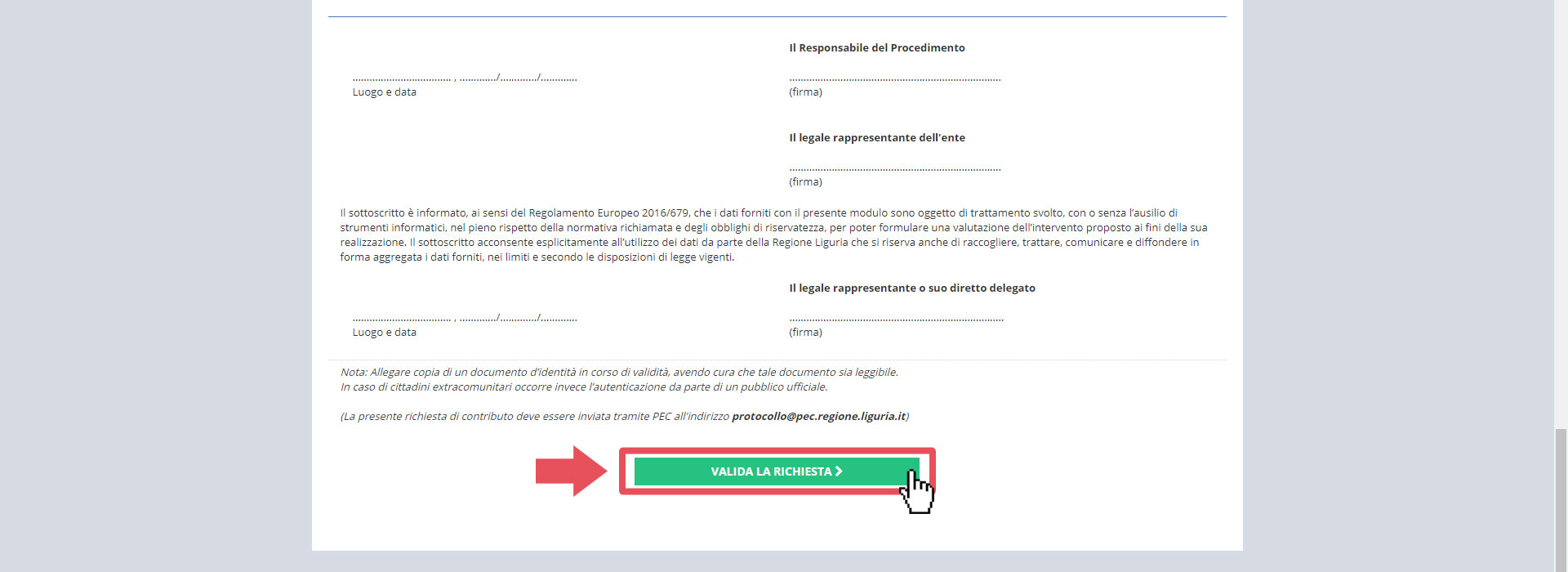 Per la validazione della richiesta è necessario premere sul pulsante “VALIDA LA RICHIESTA” posto in fondo alla scheda di riepilogo.