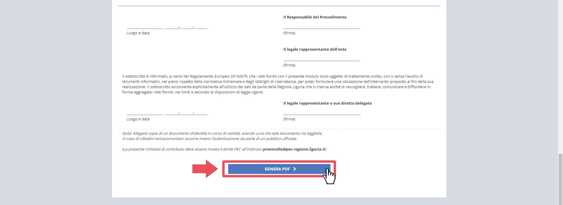 Dopo aver validato la richiesta premere "GENERA PDF" per scaricare il documento in formato pdf.