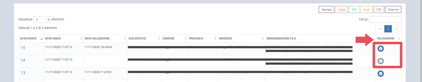 - DATA VALIDAZIONE: indica la data e ora in cui la richeista è stata validata.