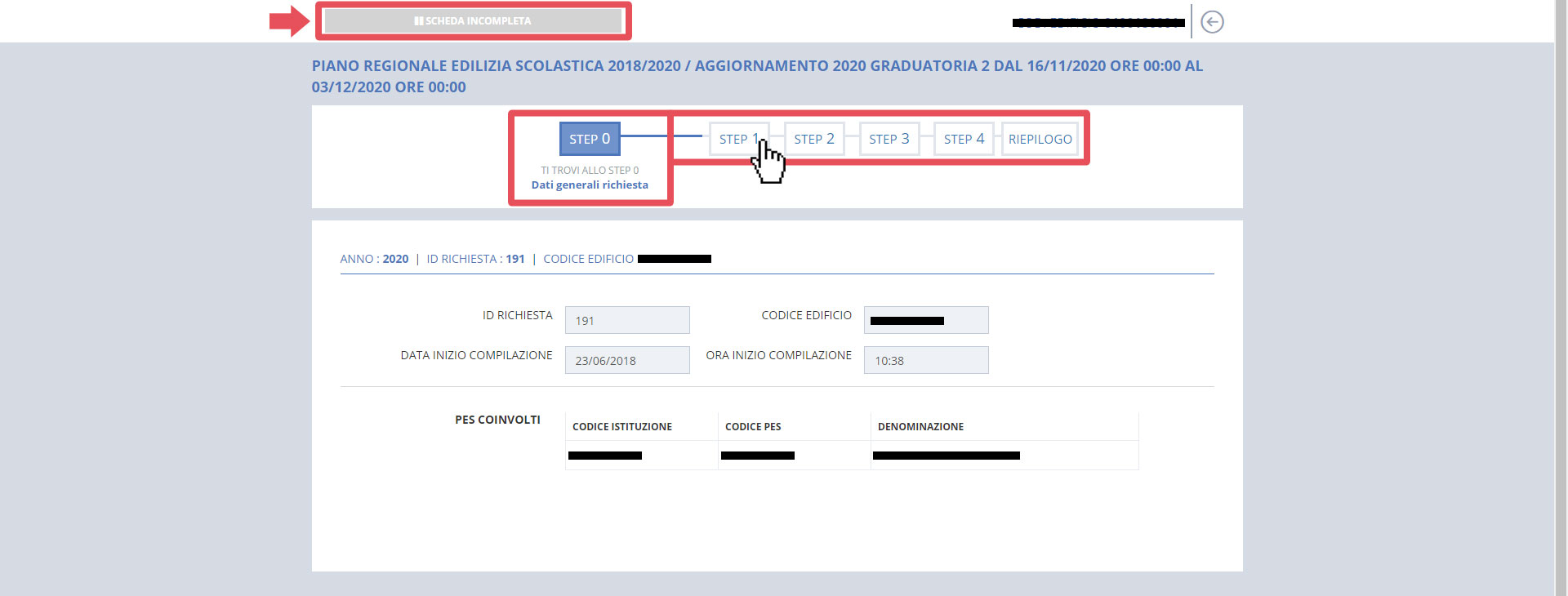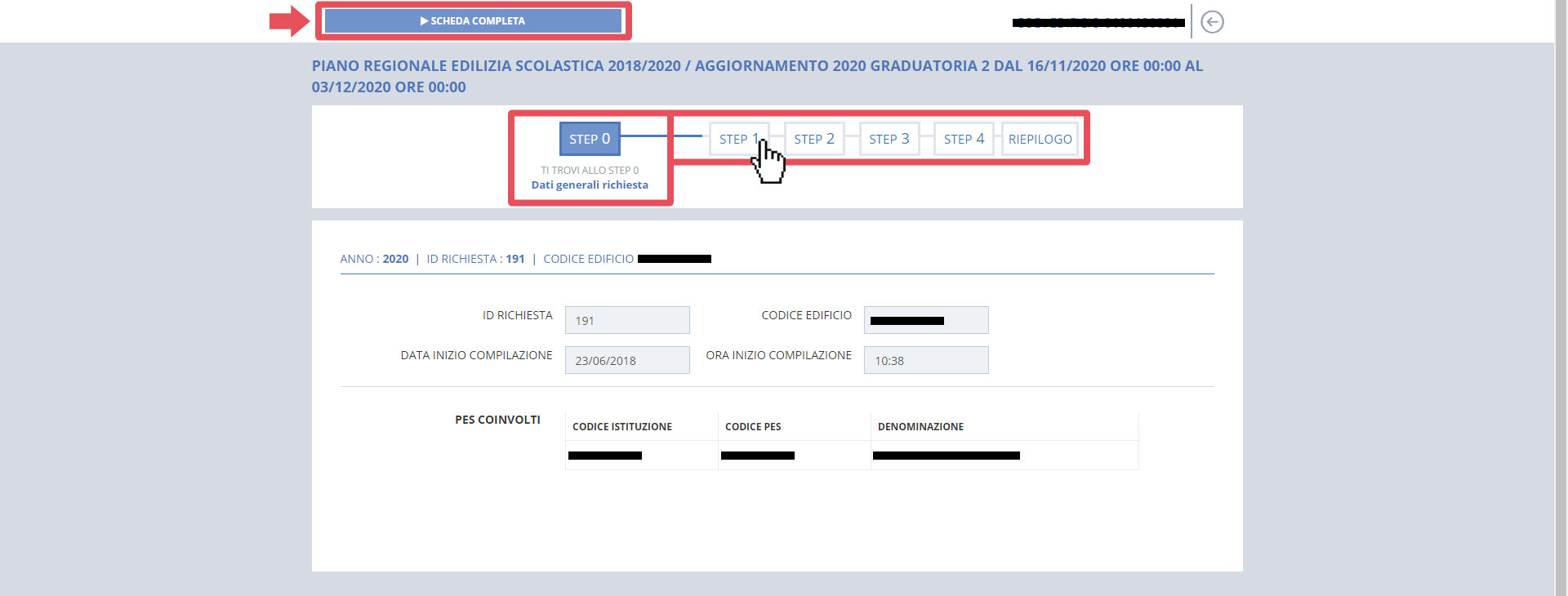 Lo STEP 0 - DATI GENERALI RICHIESTA mette in evidenza i dati generali riferiti alla richiesta. Questo step non contiene campi da compilare. Per passare allo STEP 1 premere il tasto “CONFERMA E VAI ALLO STEP SUCCESSIVO” in fondo alla scheda oppure premere il tasto "STEP 1" nel menu di navigazione degli step.