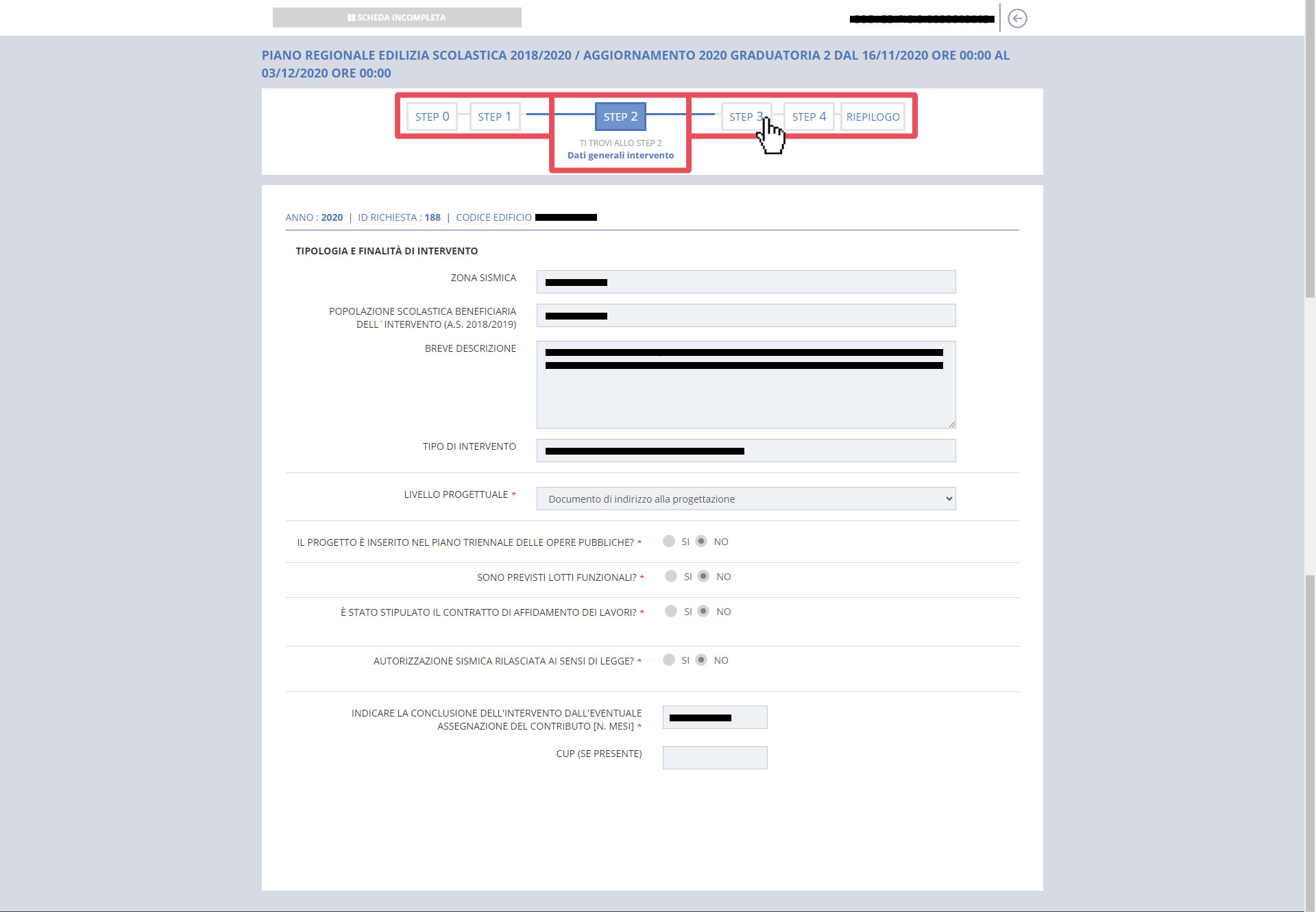 La compilazione della richiesta continua con lo STEP 2 - DATI GENERALI INTERVENTO dove vengono riportati i dati riguardanti la tipologia e la finalità dell'intervento. L'utente Regione visualizza i dati in sola lettura.