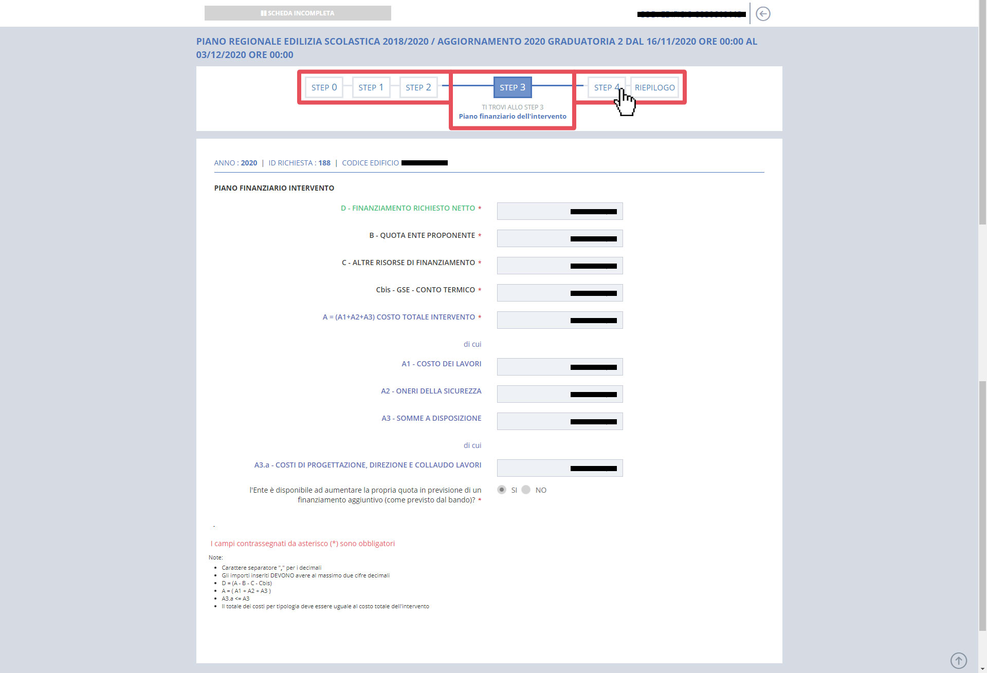 La richiesta continua con lo STEP 3 - PIANO FINANZIARIO DELL'INTERVENTO in questo step sono inserite le varie voci economiche (quote; risorse; costi; oneri; ecc). Il sistema calcola in automatico il FINANZIAMENTO RICHIESTO NETTO, sulla base dei dati inseriti. L'utente Regione visualizza i dati in sola lettura.