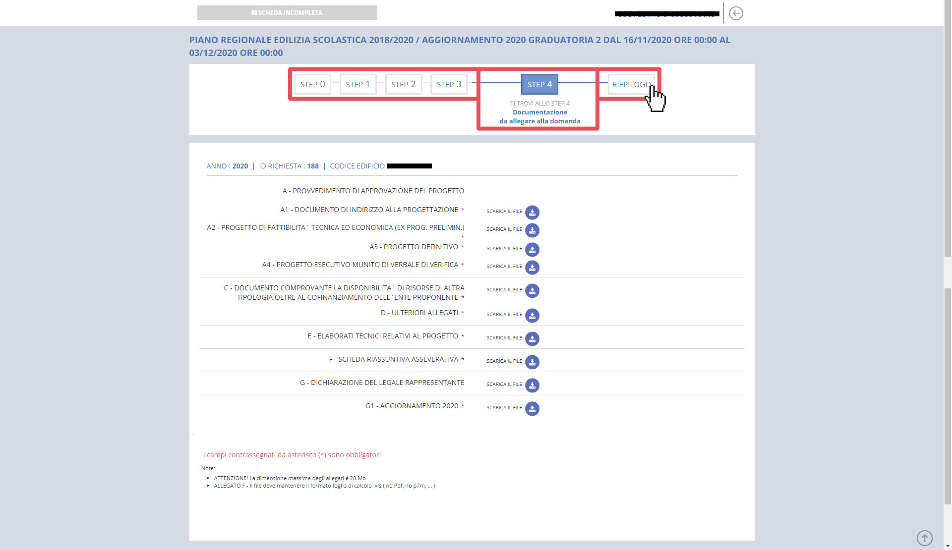 La richiesta continua con lo STEP 4 - ALLEGATI, dove è richiesto allegare i vari file necessari.